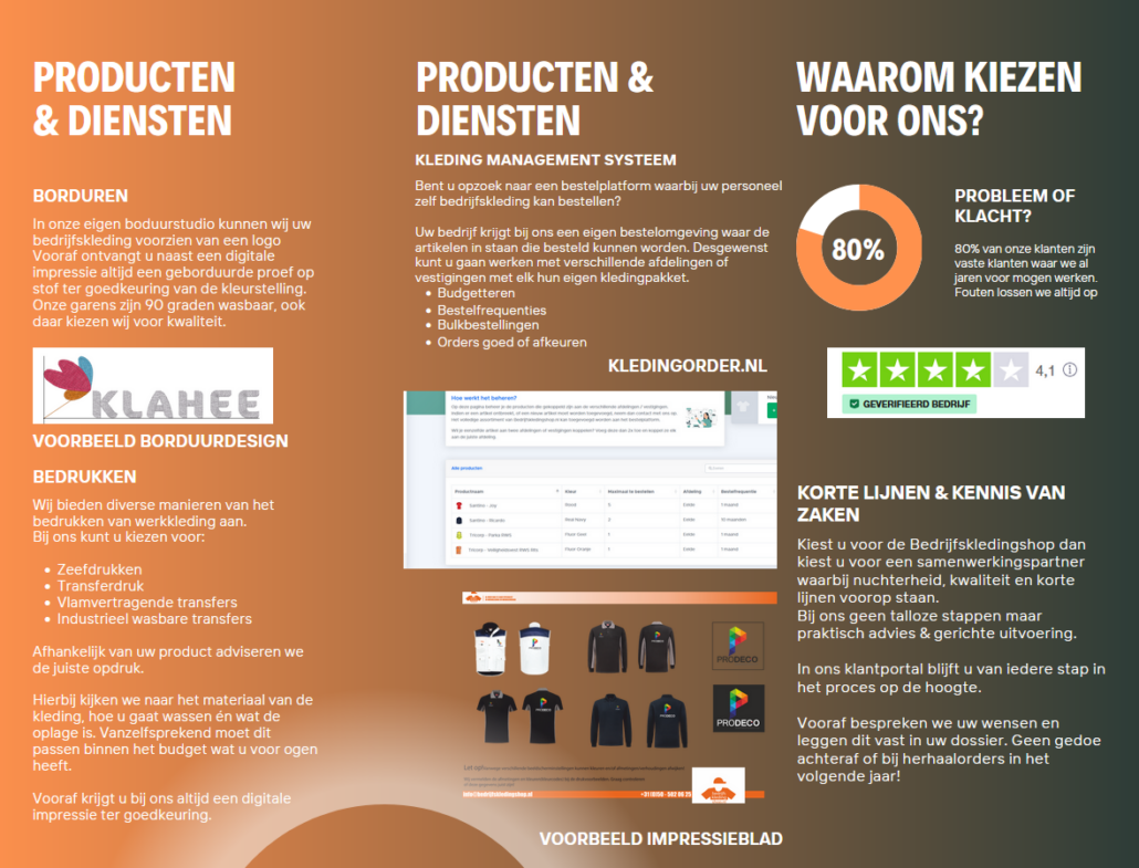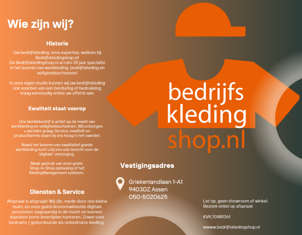 Al ruim 37 jaar uw partner in Bedrijfskleding – Borduren & Bedrukken. Korte lijnen, snel geleverd en altijd oog voor de beste service & kwaliteit. Bedrijfskledingshop.nl – Vraag online eenvoudig je offerte aan voor het borduren en bedrukken van bedrijfskleding. Of kijk rond en ervaar onze scherpe prijzen!